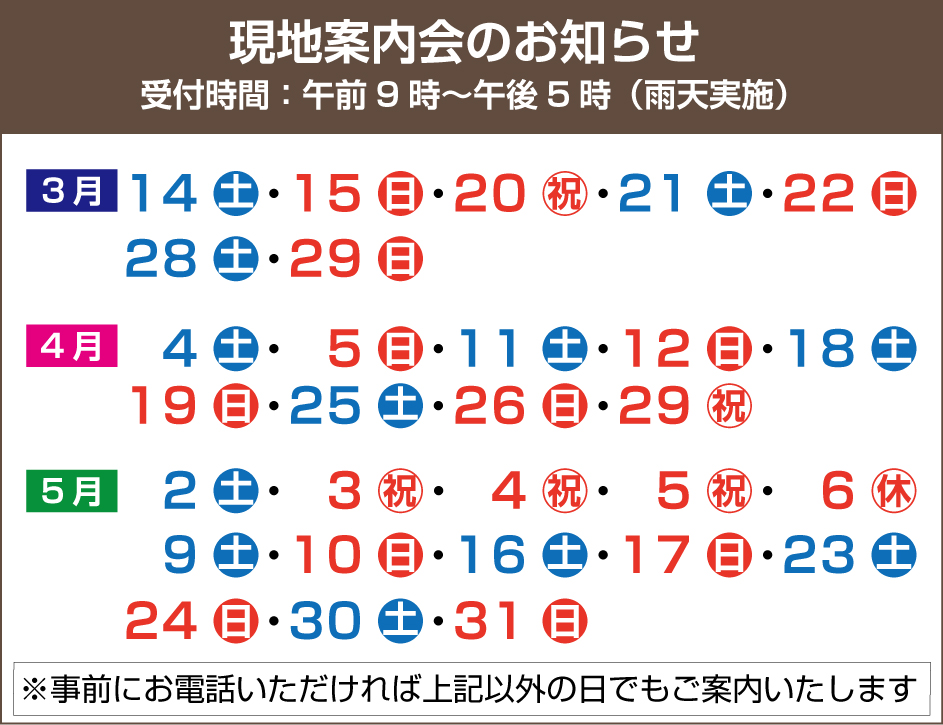 現地ご案内会開催中!※事前にお電話いただければご案内いたしますのでお気軽にご連絡ください。受付時間 午前9時~午後5時まで雨天実施
